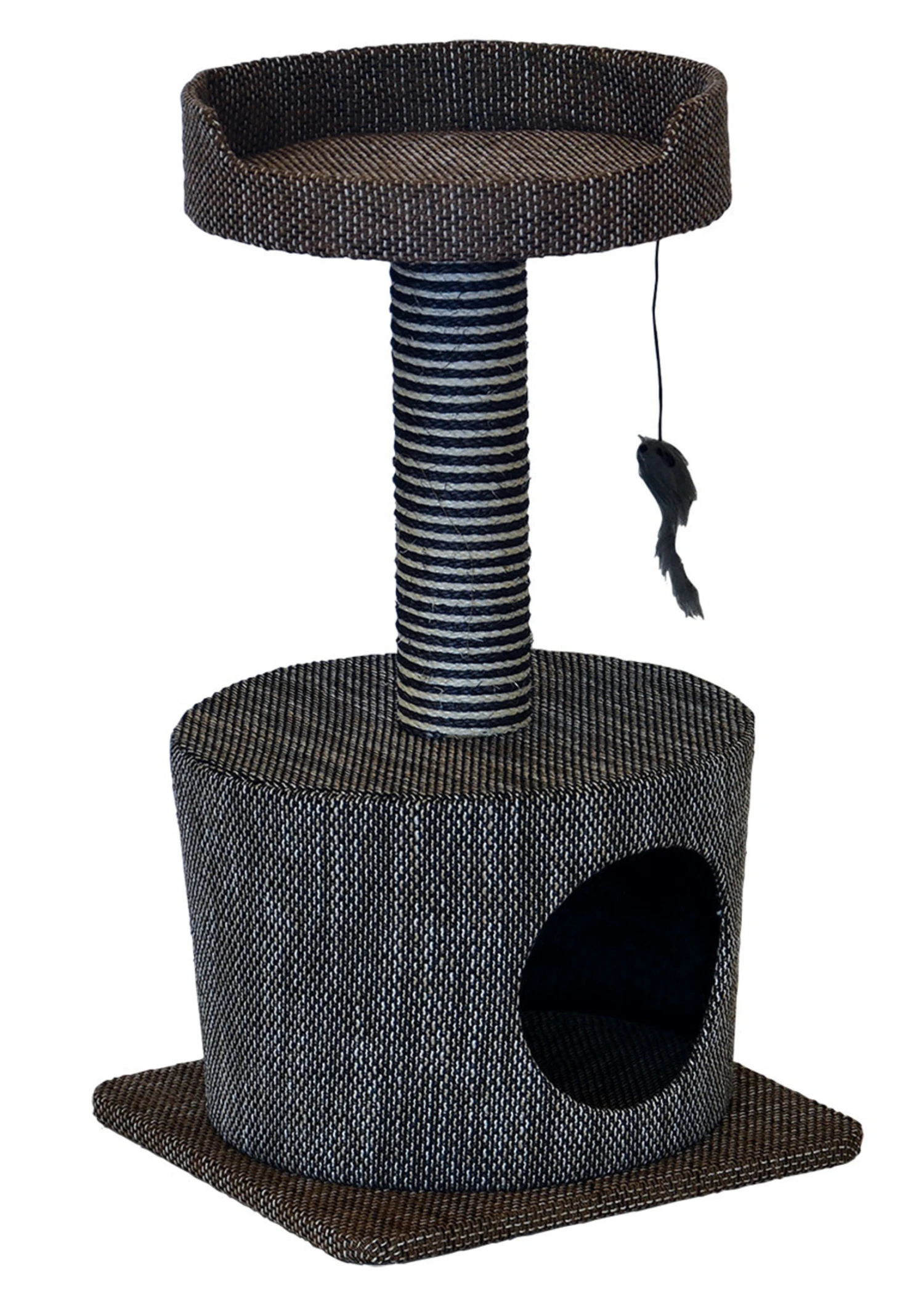 The Basic Cat Tree features a sleeping hideout at the base, with a center scratching post where felines can mark their territory by scratching, trimming and cleaning their nails. A furry mouse toy hangs off the bottom of the upper most level for your feline to stay entertained when scratching or sleeping is no longer a priority. The highest level provides a second resting space, where your cat can view their domain and observe their environment like they would normally do in the wild. This stylish Cat Tree has warm and woven brown toned colors that will look great in any space. Bring the Basic Cat Tree home and give your felines a space of their own, where they can do what cats do best! 15.5″ x 15.5″ x 29″