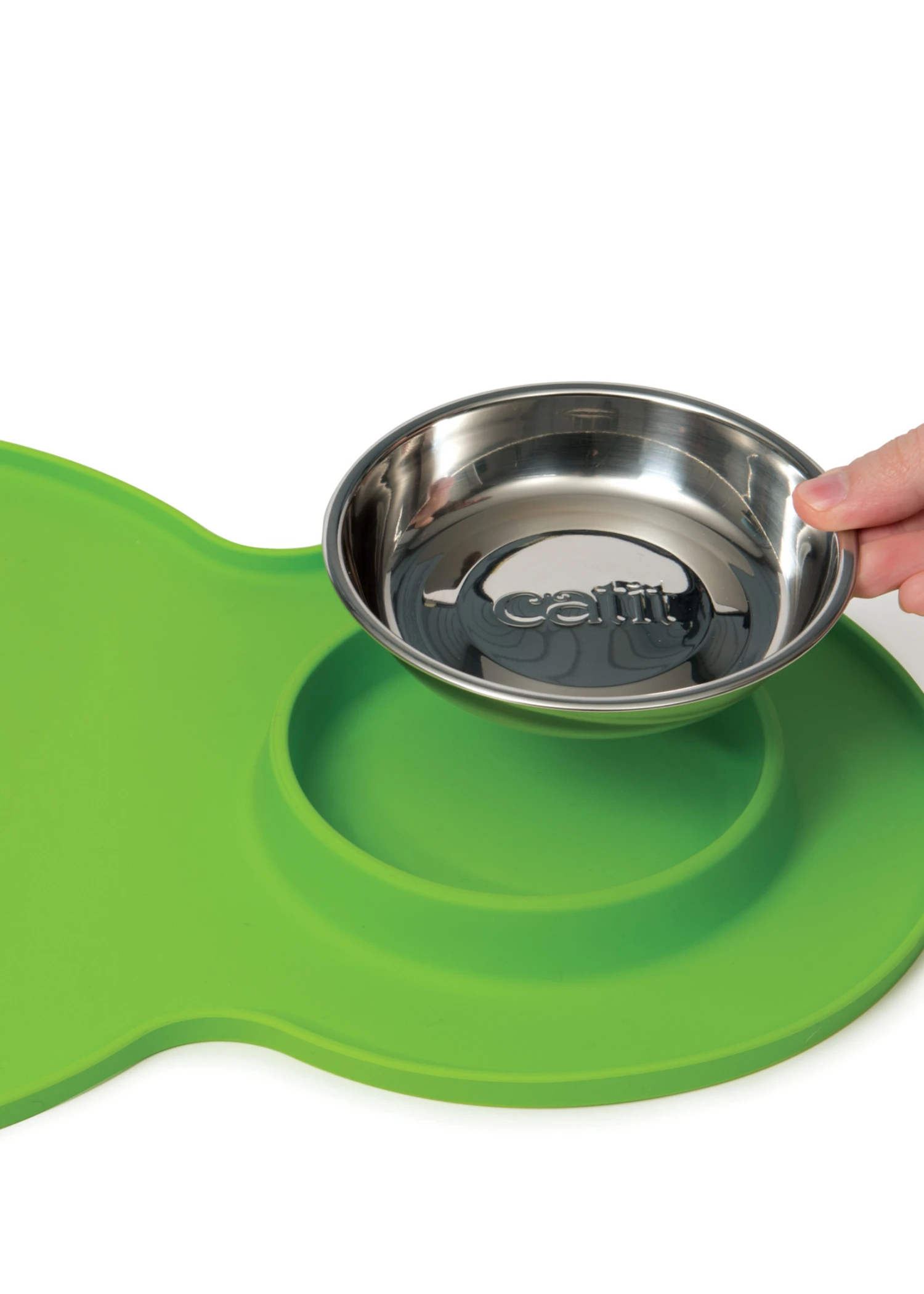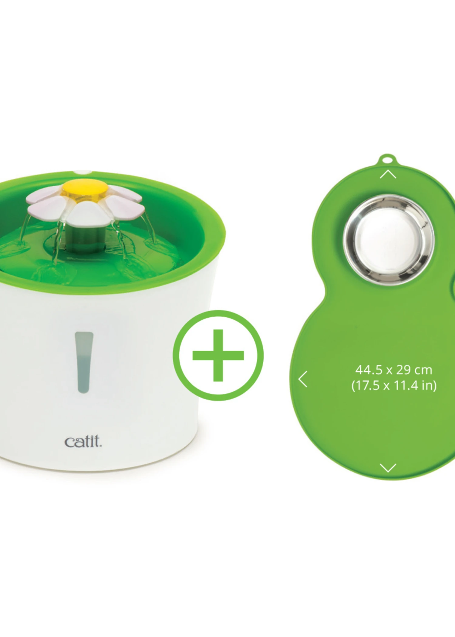 This anti-slip placemat will keep your fountain in place and protects your floors and counter tops from spills. The placemat includes a hygienic, removable stainless-steel dish. The dish has a shallow, whisker stress-free design and can be used with wet or dry food.
