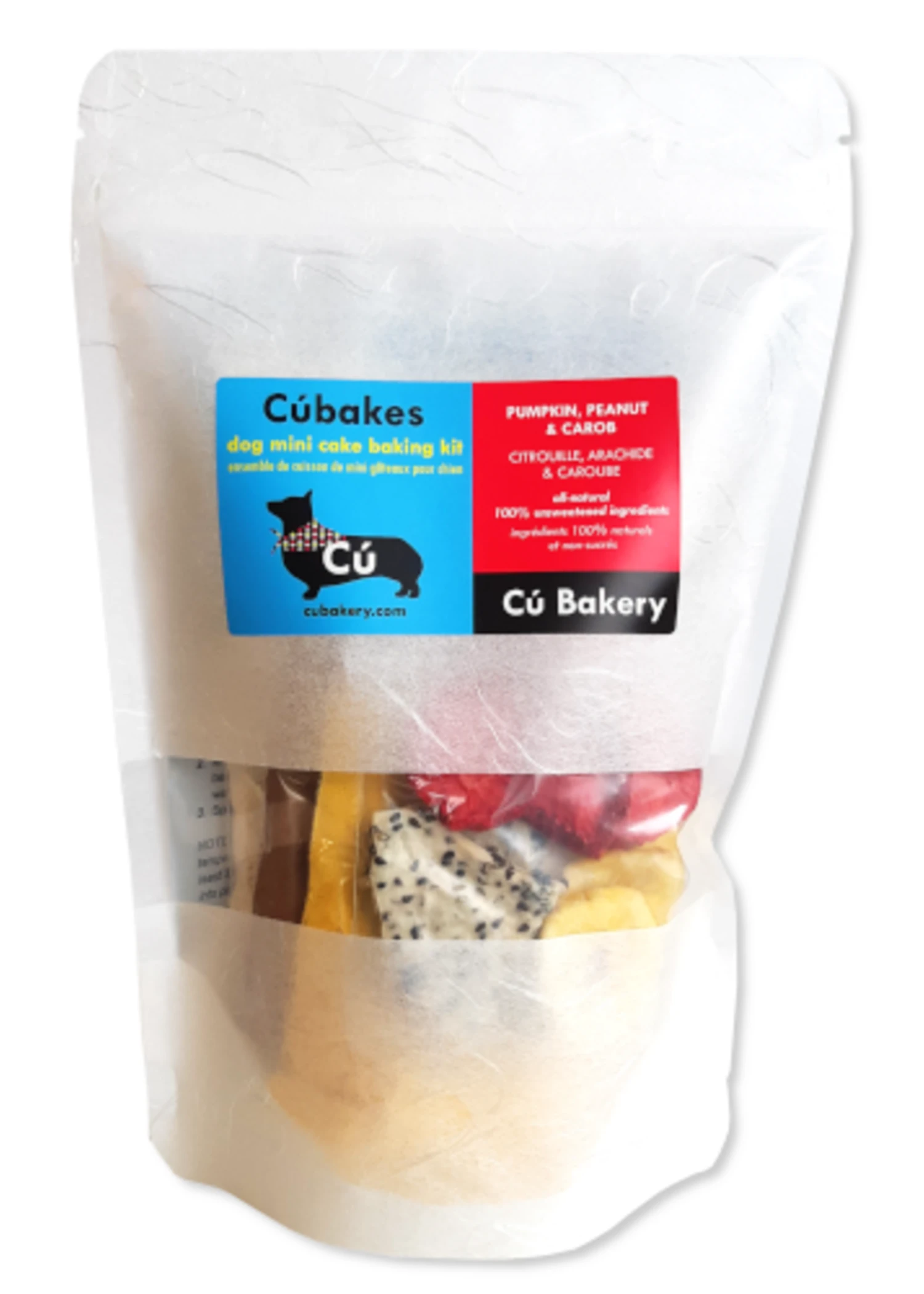 Cúbakes mini cake baking kit includes an all-natural & 100% unsweetened pumpkin-peanut cake mix, carob icing mix, strawberry, banana and/or dragonfruit toppings. Cakes have a moist brownie-like texture and stay together well for low mess eating. Great for special and everyday occasions!