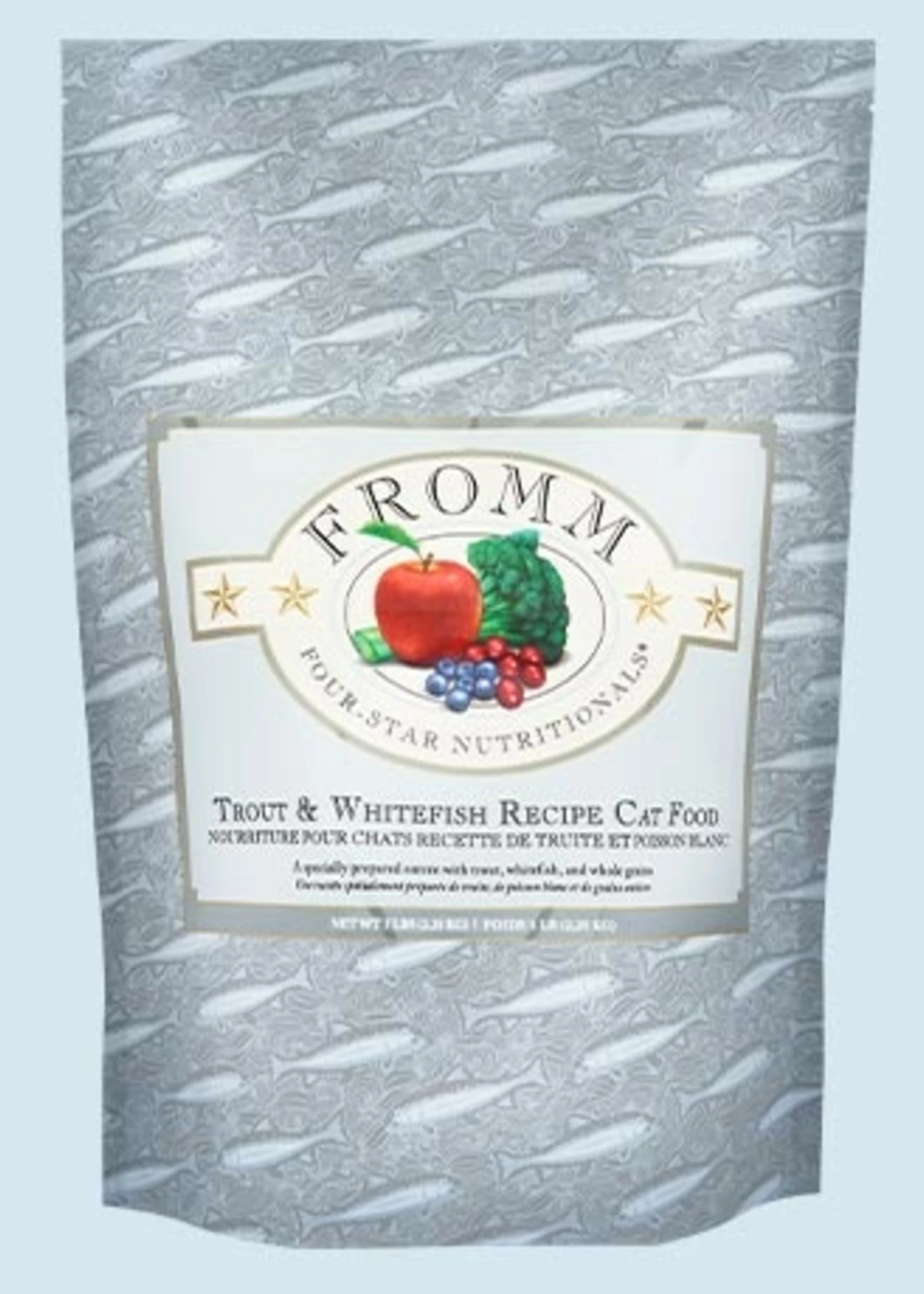 Trout, Whitefish, Menhaden Fish Meal, Dried Egg Product, Salmon Meal, Whole Barley, Whole Oats, Brown Rice, Natural Flavor, Canola Oil, Oatmeal, Pearled Barley, Salmon Oil, Dried Tomato Pomace, Miscanthus Grass, Flaxseed, DL-Methionine, Broccoli, Apples, Vitamins, Chicory Root Extract, Taurine, Sorbic Acid (Preservative), Minerals, Salt, Cranberries, Yucca Schidigera Extract, Sodium Selenite, Blueberries, Probiotics.
