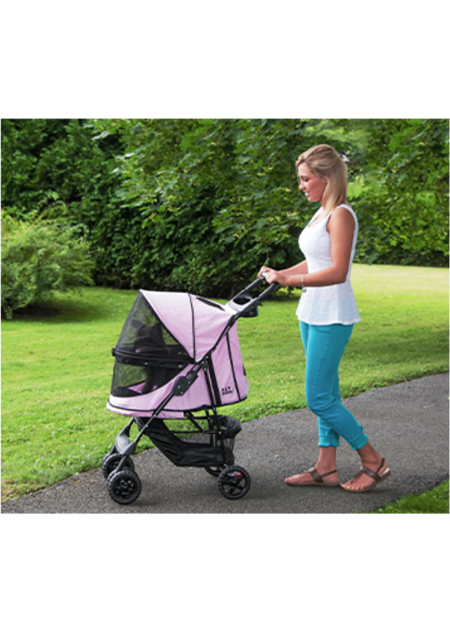 Pet Gear® has really “raised the bar” with our new Happy Trails NO-ZIP stroller. No zippers means no hassle when trying to open and close the stroller. Our new NO-ZIP technology means that you can easily gain access to your pet without fumbling with difficult zippers! The Happy Trails NO-ZIP stroller also features an elevated paw rest. Your pet can easily look out of the stroller by using the front bar for support. The new panoramic view window allows your pet to remain safe inside of the stroller without missing any sights while you stroll!
