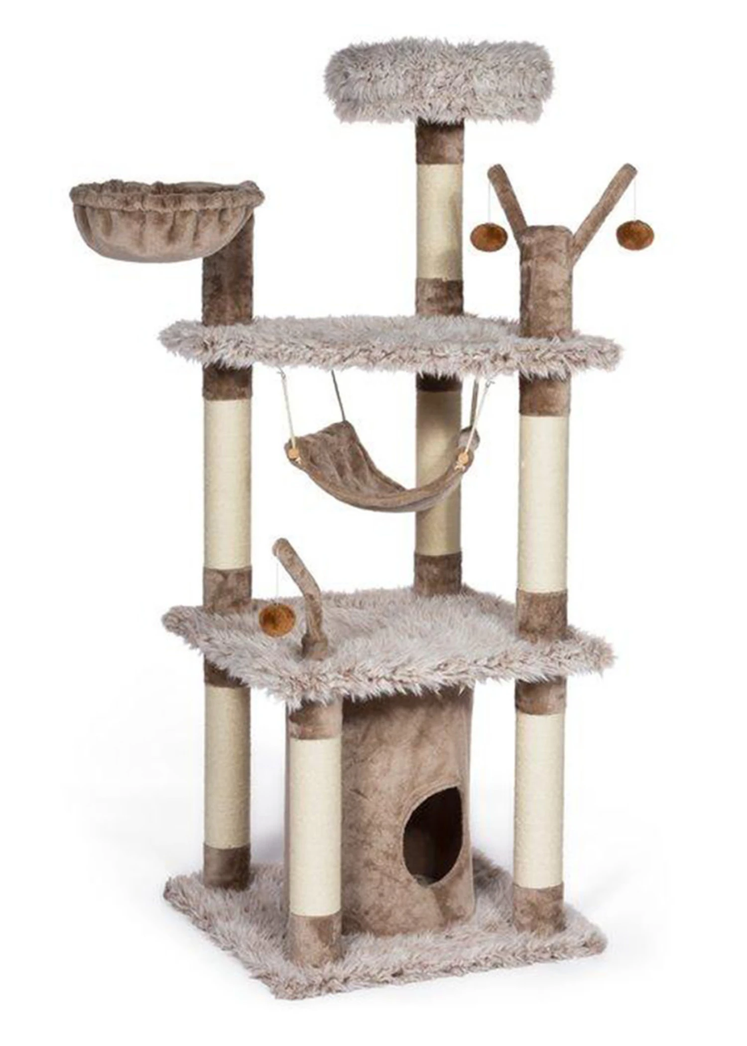 Scratching posts help satisfy natural clawing instincts, helping to keep your furniture safe from destructive restless behaviors. The hideaway, day bed, hammocks, and platforms are coated with soft plush, giving your cat or cats comfortable spaces to play, rest, and relax. Dangling toys will tease your pet and encourage fun and active playtime. 30″ x 30″ x 61″