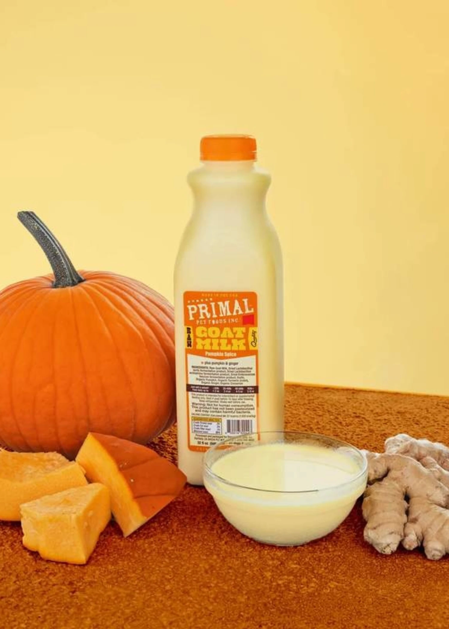 Ingredients: Raw Goat Milk, Organic Pumpkin, Dried Lactobacillus lactis fermentation product, Dried Lactobacillus acidophilus fermentation product, Dried Enterococcus faecium fermentation product, Inulin, Organic Turmeric (color), Organic Ginger, Organic Cinnamon.